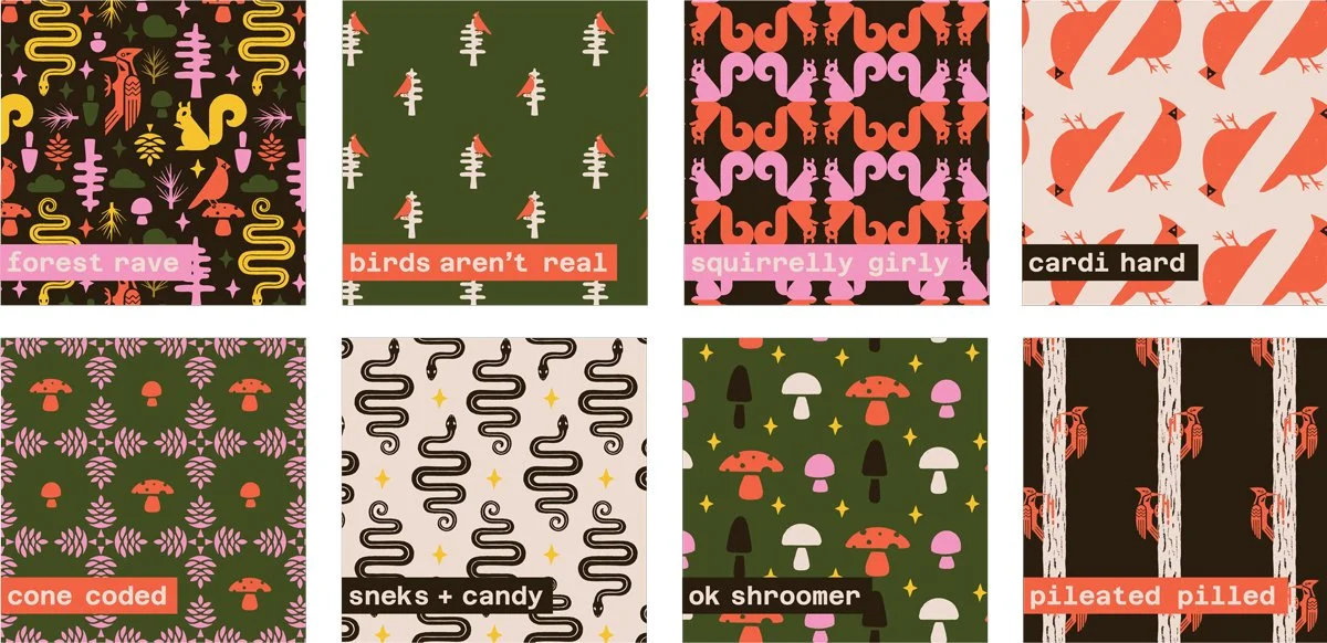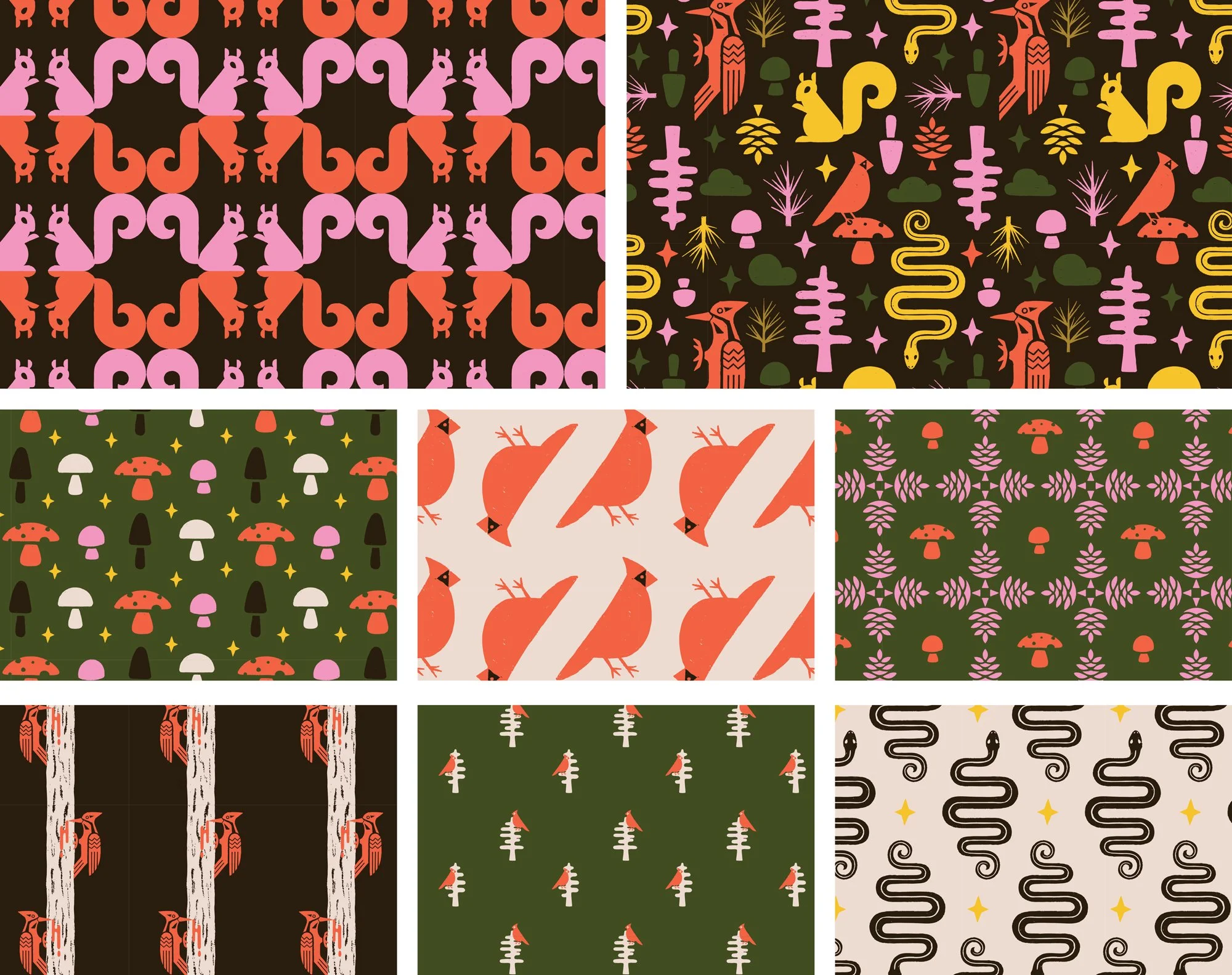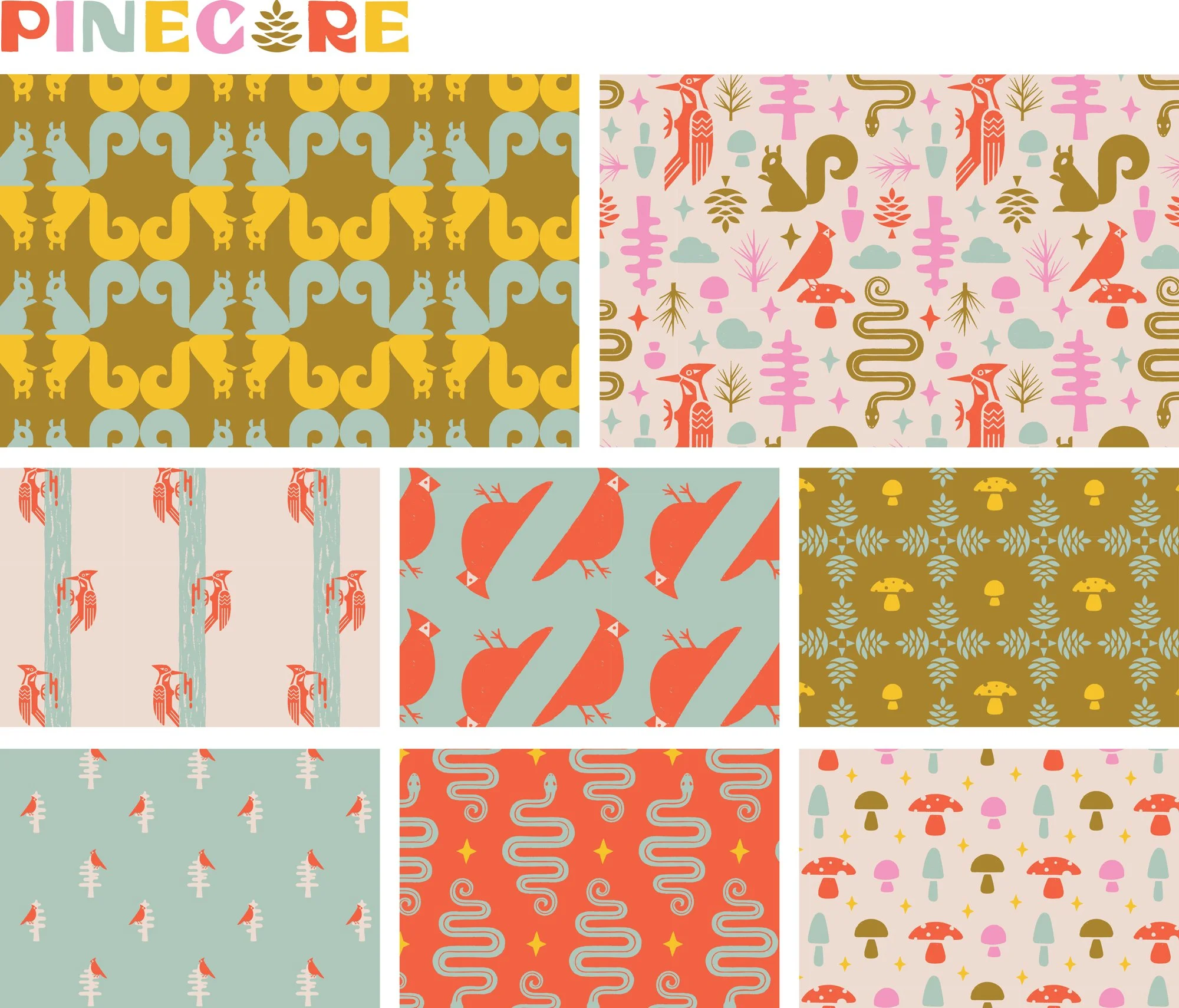 Pinecore is a pattern collection inspired by the Northwoods and the bold minimalism of the 1970s, with a dose of party energy. All patterns are available for licensing; if interested please contact me at hello@home-squirrel.com